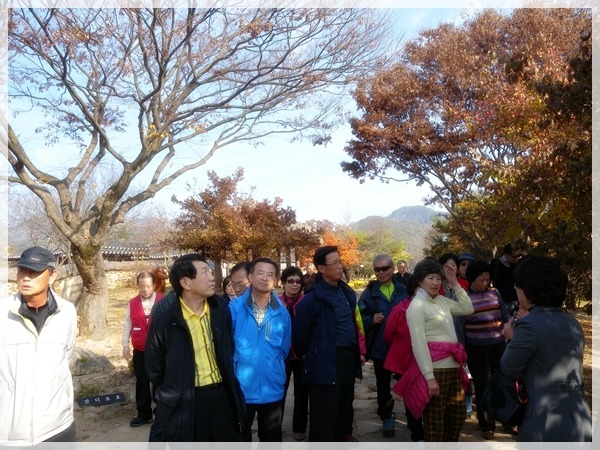 : 청풍문화재단지내 고택 앞에서 문화관광해설사분의 설명을 듣고 있는 모습입니다.